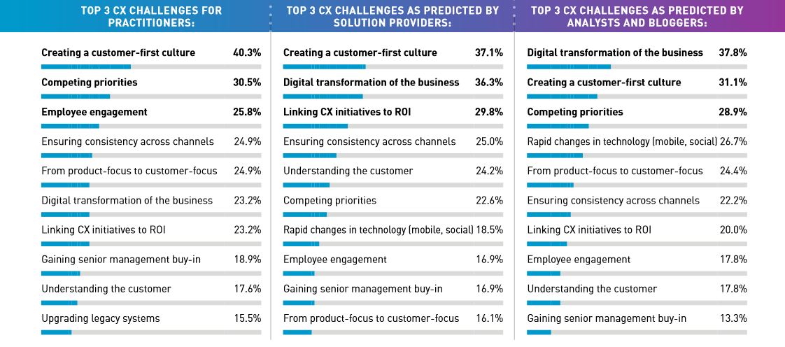 If you click on the image, you’ll be able to see a larger version of it. You’ll see how the practitioner responses compared to the predictions of vendors and consultants. Creating a customer-first culture is the top challenge for practitioners, followed by competing priorities, employee engagement, omnichannel experiences, and shifting from a product-focus to a customer-focus.